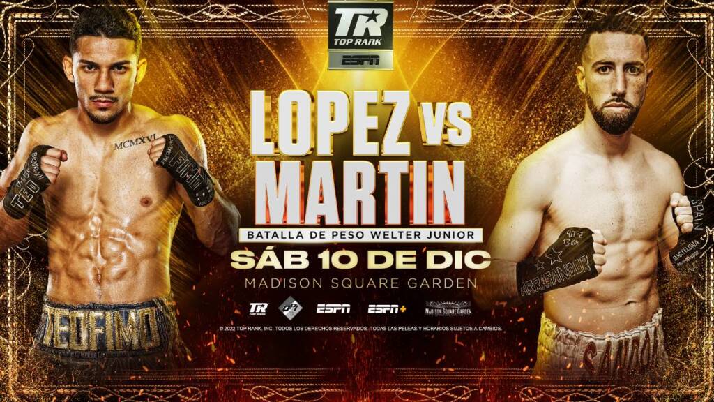 López (17-1, 13 KOs), el ex rey de los pesos ligeros, hizo su debut en el peso junior welter en agosto con un nocaut en el séptimo asalto sobre Pedro Campa. Espera convertirse en campeón mundial de dos-divisiones en el 2023, pero el contendiente de peso junior welter número 1 de la OMB primero debe derrotar al resbaladizo zurdo español. Martin (40-2, 13 KOs), oriundo de Barcelona, fue el autor de la sorpresa del año 2021 cuando sorprendió a Mikey García por decisión mayoritaria y envió al campeón mundial de cuatro divisiones al retiro. Martin, clasificado entre los primeros 15 por las cuatro principales organizaciones sancionadoras, siguió el triunfo de García con una decisión unánime de 10 asaltos sobre José Félix en abril.