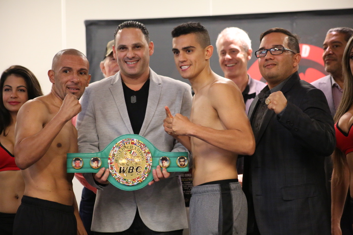 San Juan, PUERTO RICO – Cumpliendo con el peso requerido para disputar el campeonato vacante FECARBOX pluma del Consejo Mundial de Boxeo, el vagalteño Angel ‘Pito’ Fret y el mexicano Bernardo Gómez derrotaron efectivamente la báscula en ceremonia celebrada en el Salón Los Rosales del Hotel Caribe Hilton en San Juan, esto para el combate estelar de ‘New Blood Revolution’ a celebrarse mañana, sábado, 19 de diciembre en el Coliseo Tomás Dones de Fajardo.