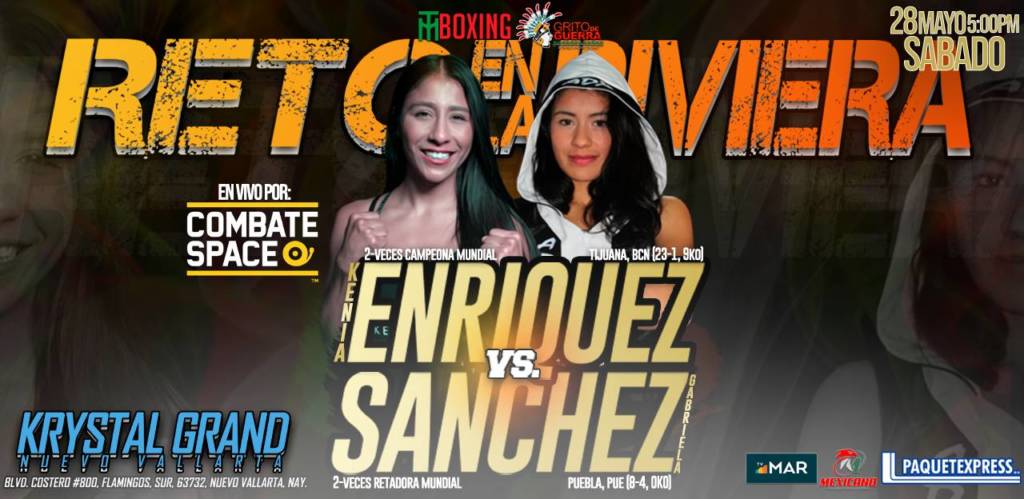 Desde el hotel 5 estrellas Krystal Grand en Nuevo Vallarta, Nayarit, México, la 2-veces campeona mundial Kenia Enríquez (23-1, 9KO) regresa a los ensogados a enfrentarse a la aguerrida Gabriela “La Bonita” Sánchez (8-4, 0KO) en el combate estelar pactado a 10 asaltos en vivo en todo Latinoamérica por el programa Combate Space por el canal Space. La cartelera es presentada por TM Boxing en asociación con Promociones Grito de Guerra.