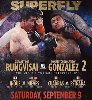 Los protagonistas del función “Superfly” el campeón Supermosca del Consejo Mundial de Boxeo (CMB) SRISAKET SOR RUNGVISAI, (43-4-1, 39 KO’s) de Si Sa Ket, Tailandia y el ex campeón mundial ROMAN “CHOCOLATITO” GONZALEZ (46-1-0, 38 KO’s), de Managua, Nicaragua, marcaron 123 y 122 libras a 30 dias de su revancha. El límite para esta división es de 127 libras a 30 días, bajo las reglas del CMB al igual que Cuadras, Estrada, Inohue y Nieves.