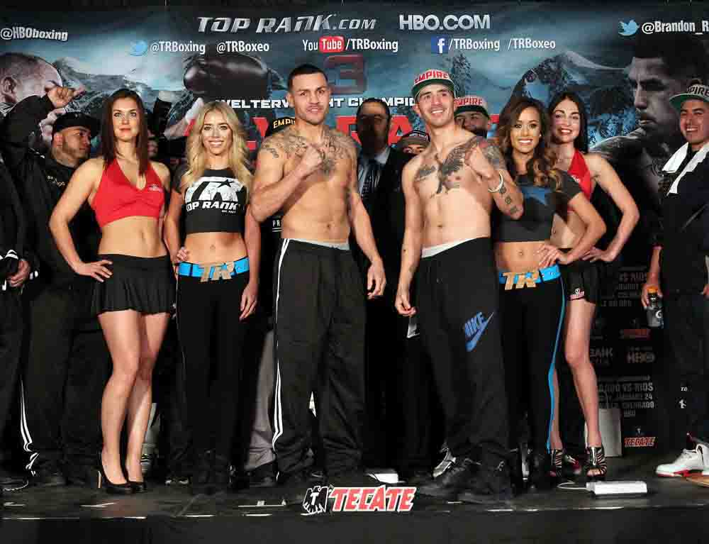 DENVER, Colorado – La esperada tercera batalla entre los excampeones mundiales “Mile High” Mike Alvarado y Brandon “Bam Bam” Ríos se disputara mañana sábado, ya que ninguno de los dos guerreros tuvo problemas para vencer a la báscula este viernes en Denver y se declararon listos para ganar el combate.