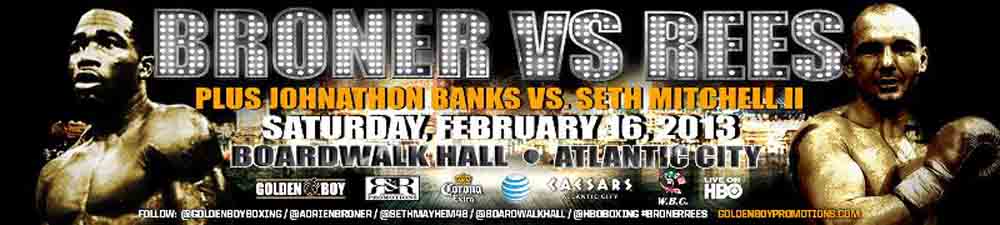 Broner vs. Rees, a 12-round fight for Broner’s WBC Lightweight World Championship took place Saturday, February 16 at Boardwalk Hall in Atlantic City, New Jersey. The event was promoted by Golden Boy Promotions, R & R Promotions, sponsored by Caesars Atlantic City and Corona and was televised live on HBO World Championship Boxing.