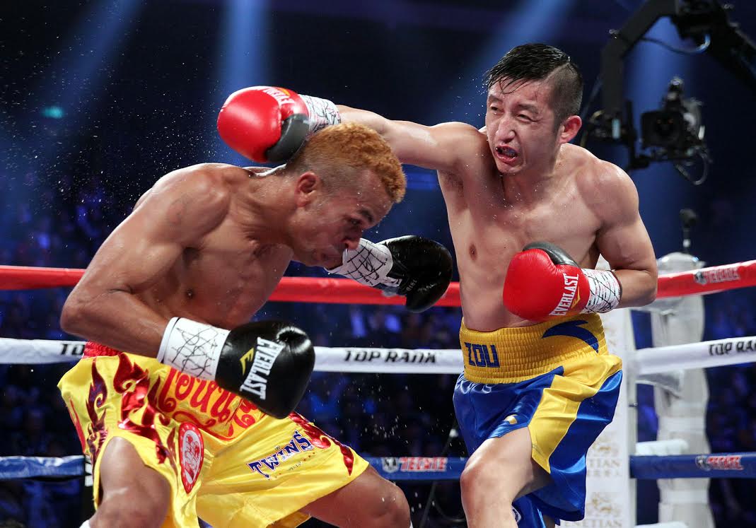 El campeón Amnat Ruenroeng (izquierda) demostró veteranía y se impuso claramente a la sensación olímpica china Zou Shiming (derecha), sobreponiéndose de un duduso ‘knockdown’ para retener el título mosca de la Federación Internacional de Boxeo (F.I.B.)