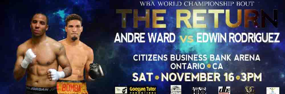SHERMAN OAKS, CA (September 20, 2013) – Following slightly more than a year’s absence from the ring due to injury, Bay Area hero, 2004 U.S. Olympic gold medalist and current WBA and Ring Magazine World Super Middleweight Champion, Andre “S.O.G.” Ward makes his highly anticipated return to the ring defending his title against Edwin Rodriguez on Saturday, November 16 at the Citizens Business Bank Arena in Ontario, CA.