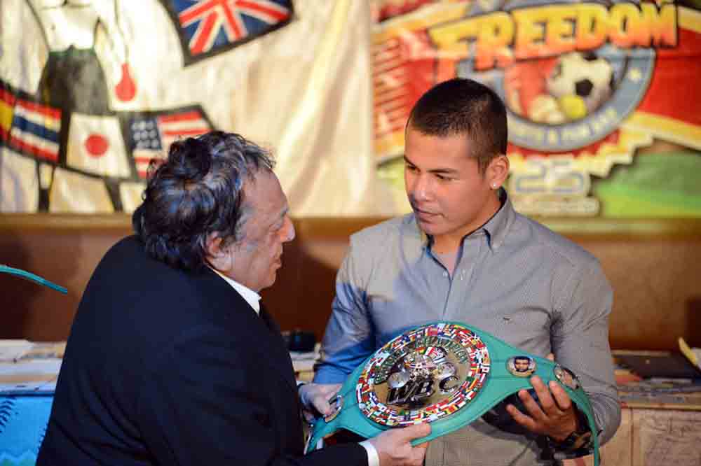 En emotivo acto, José Sulaimán entregó a Gutiérrez Vera el fajín que conquistó al derrotar a Salvador Sánchez II, el pasado 20 de abril en el Alamodome de San Antonio, Texas.