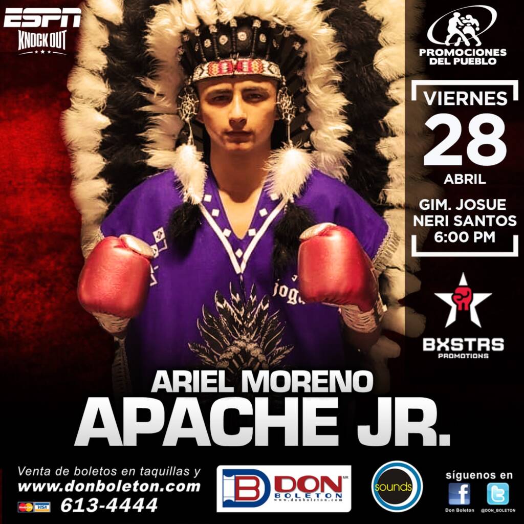 MÉXICO – El invicto juarense Ariel ‘Apache’ Moreno Jr. sostendrá un duelo de alto grado de dificultad el próximo viernes 28 de abril en Ciudad Juárez, donde enfrentará al experimentado Iván ‘Pollito’ Meneses, un hombre de gran recorrido y que ha enfrentado a siete campeones del mundo en su larga trayectoria.