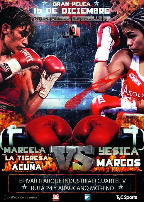En el tope central de la noche, la formoseña y pionera del boxeo femenino nacional, Marcela Eliana “Tigresa” Acuña (44-6-1, 18 KO), se medirá en una esperada revancha con la mendocina radicada en Santiago de Chile, Yésica Patricia “Bombón Asesino” Marcos (27-0-2, 9 KO), donde estará en juego el título mundial supergallo de la Federación Internacional de Boxeo (FIB), que se encuentra vacante, en combate pactado a la distancia de diez asaltos de 2×1.