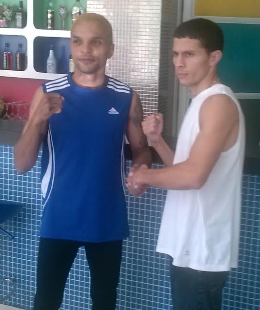 McWilliams Arroyo (derecha), el primer clasificado de la Federación Internacional de Boxeo (FIB) en el peso mosca, tuvo hoy su primer encuentro con su rival de este miércoles, el tailandés Amnat Ruenroeng (izquierda), monarca de la FIB en las 112 libras, a su llegada a Nakhon Rathchasima, ciudad sede de su pelea.