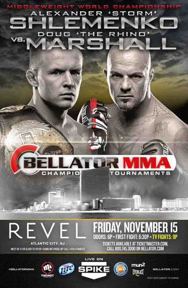 Newport Beach, CA. (October 2, 2013) – Bellator MMA returns to Revel in Atlantic City, New Jersey onFriday, November 15th as reigning Bellator Middleweight Champion Alexander “Storm” Shlemenko will put his title on the line against Doug “The Rhino” Marshall.