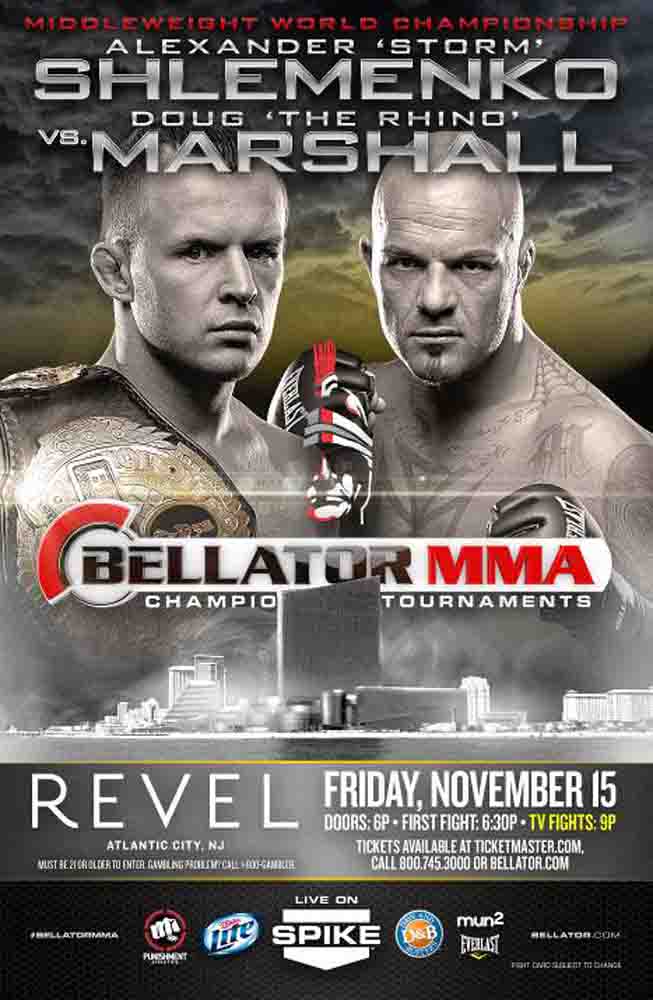Newport Beach, CA. (October 21, 2013) – Bellator MMA will return to Atlantic City’s Revel on Friday, November 15th live on Spike TV as Alexander Shlemenko will put his title on the line against Season 8 Bellator Middleweight Tournament winner Doug “The Rhino” Marshall. The night will also showcase the Bellator Featherweight Tournament Final as Patricio Pitbull and Justin Wilcox will square off for a $100,000 prize and a guaranteed title shot, as well as a full card of the east coast’s top talent.