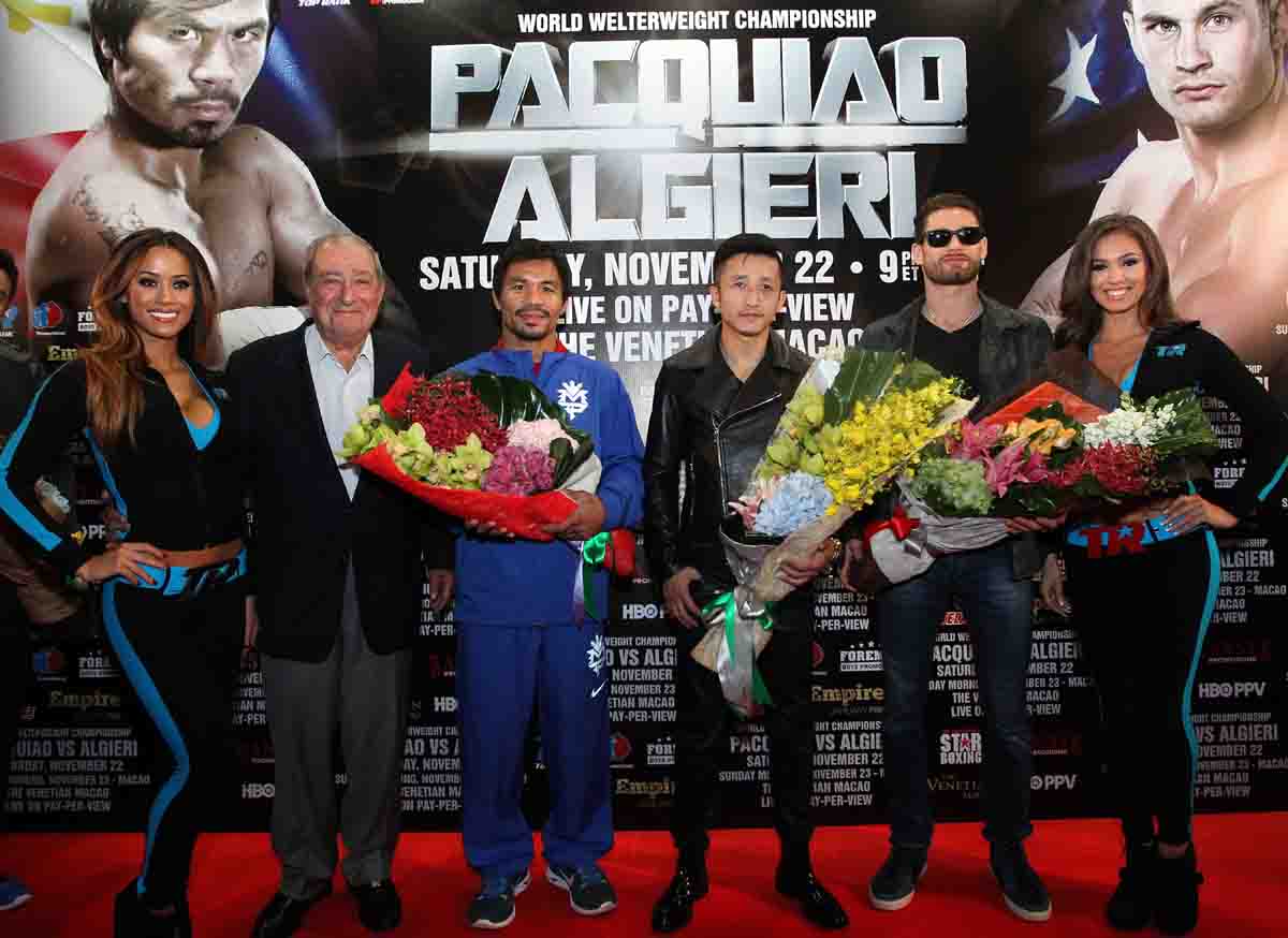 El legendario boxeador filipino Manny “Pacman” Pacquiao y su próximo rival el campeón mundial invicto Chris Algieri fueron recibidos hoy oficialmente por miles de aficionados que se dieron cita en el Hotel Venetian de Macao, China donde este sábado 22 de noviembre disputaran la corona de peso welter de la Organización mundial de boxeo (OMB) que será televisado por HBO a través del sistema de pago por evento.