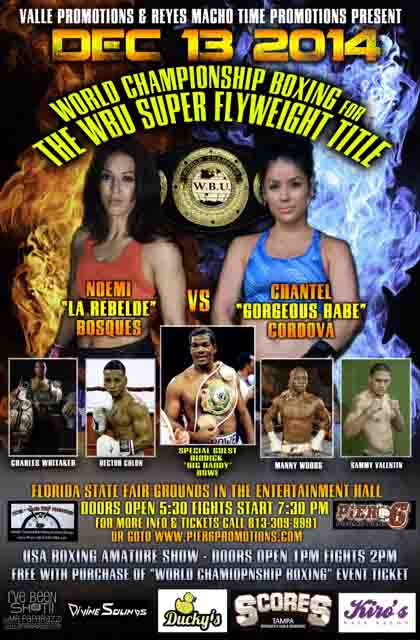 Bosques_Cordova_PosterSt. Petersburg, Florida’s Noemi Bosques is set for her first taste of Championship action, this coming Saturday, when she challenges Pueblo, Colorado’s Chantel Cordova for the vacant World Boxing Union (WBU) Super Flyweight Championship, at the Florida State Fairgrounds.