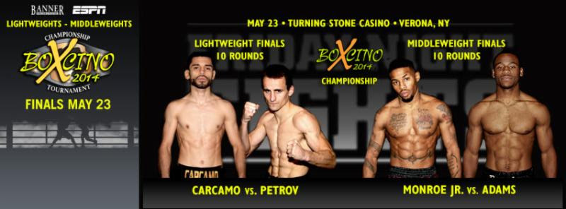 Verona, NY (May 21, 2014)–Once again the stakes have been raised for this Friday night’s Boxcino 2014 championship bouts.When the tournament began it was known that the fighters would be competing for the Boxcino championship belt. Now two more belts will be on the line as the NABA and the NABO belts will be up for grabs when lightweights Fernando Carcamo and Petr Petrov do battle while in the middleweight finals it will be undefeated Brandon Adams taking on Willie Monroe Jr. will square off for the three titles.