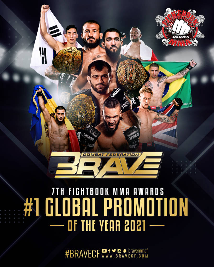 BRAVE Combat Federation obtuvo un reconocimiento notable en la séptima edición anual de los FightBook MMA Awards por sus esfuerzos durante un 2021 récord, en el que la organización de MMA de más rápido crecimiento en el mundo viajó a siete países en el último año calendario, una hazaña que solo fue logrado por BRAVE CF en el ’21.