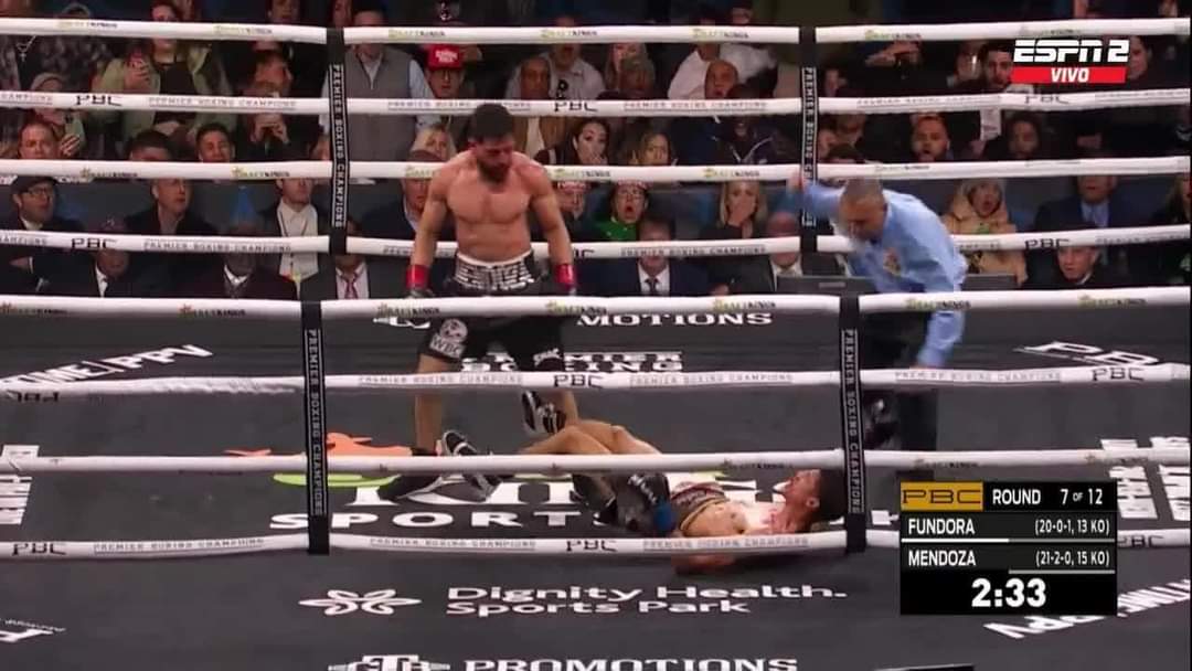 Fundora cayó a la lona y no pudo reunir la fuerza para ponerse de pie cuando el árbitro Ray Corona contó hasta 10. Un decepcionado Fundora sacudió la cabeza mientras un extasiado Mendoza caía de rodillas y golpeaba la lona en celebración. La pelea fue cancelada a los 39 segundos del séptimo asalto.