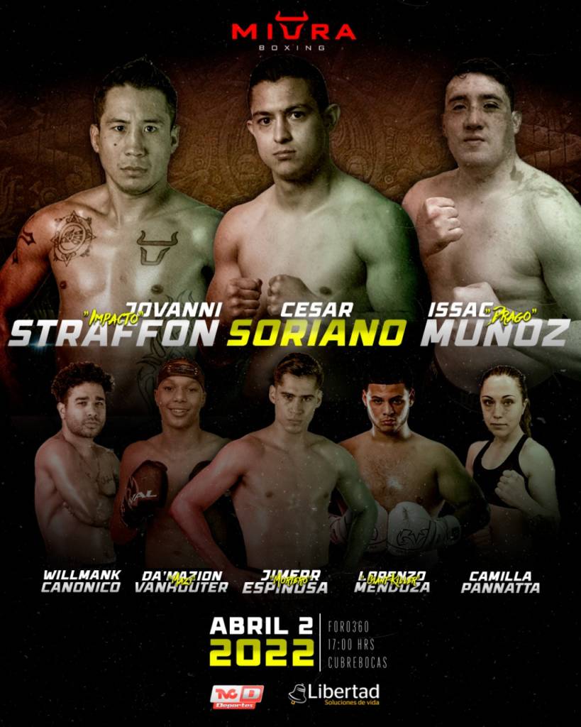 La cartelera principal será trasmitida a través de TVC deportes para México y la cartelera completa por Miuraboxing.com para el resto del mundo, totalmente en vivo en donde contará con un atractivo respaldo, destacando la participación del tremendo noqueador de Isla, Veracruz y ex campeón mundial de la IBO, Jovanny “Impacto” Straffon, quien saltará al encordado con la intención de adjudicarse un explosivo triunfo, al hacerle frente al michoacano Alejandro “Jano” Jimenez, ocho rounds en peso pactado hasta 62.000 kilogramos.