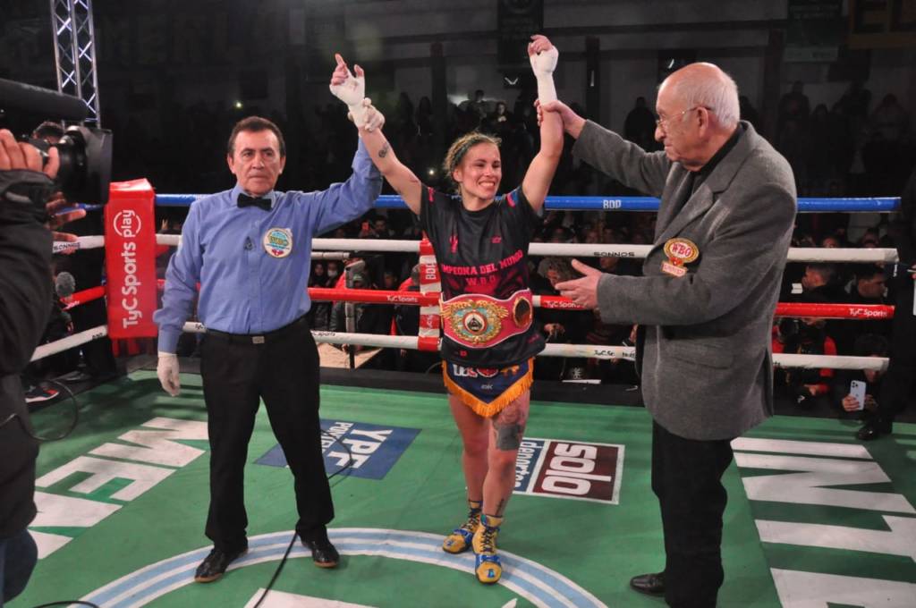 ARGENTINA ‐ En un colmado Ferro de Merlo, con 2500 almas presentes, la anfitriona Celeste “Chucky” Alaniz (50,300 / 13-0-0, 5 KO), se consagró nueva campeona mundial mosca OMB, tras vencer y destronar por nocaut técnico en el séptimo giro a la entonces campeona y quien defendía por primera vez su reinado, la bonaerense de Saladillo, Tamara “La Rebelde” Demarco (50,700 / 12-5-0). El pleito pudo disfrutarse por la pantalla de TyC Sports y TyC Sports Play, en el marco de una nueva producción internacional de OR Promotions.