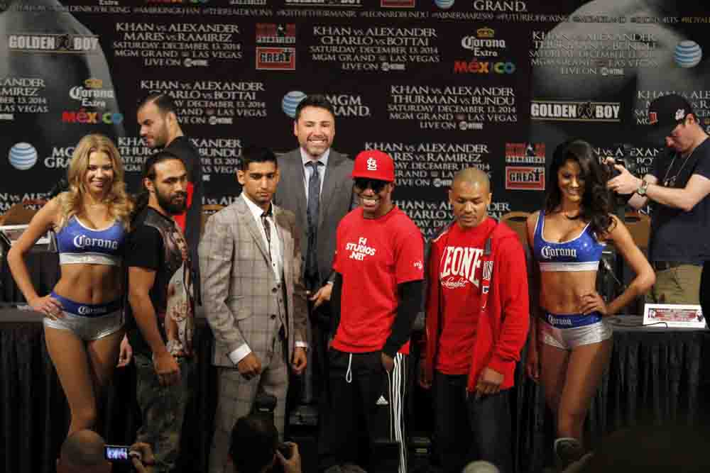 Oscar siguió su emana presentación al dejarle el micrófono a Davon Alexander quien dijo que está muy contento con su debut en Las Vegas, y aclaro que no le gusta eludir batalla que se enfrenta al que le pongan enfrente y agradece a Khan por aceptar el reto y agrego que sus fanáticos ingleses estarán muy contentos de la tunda que le espera.