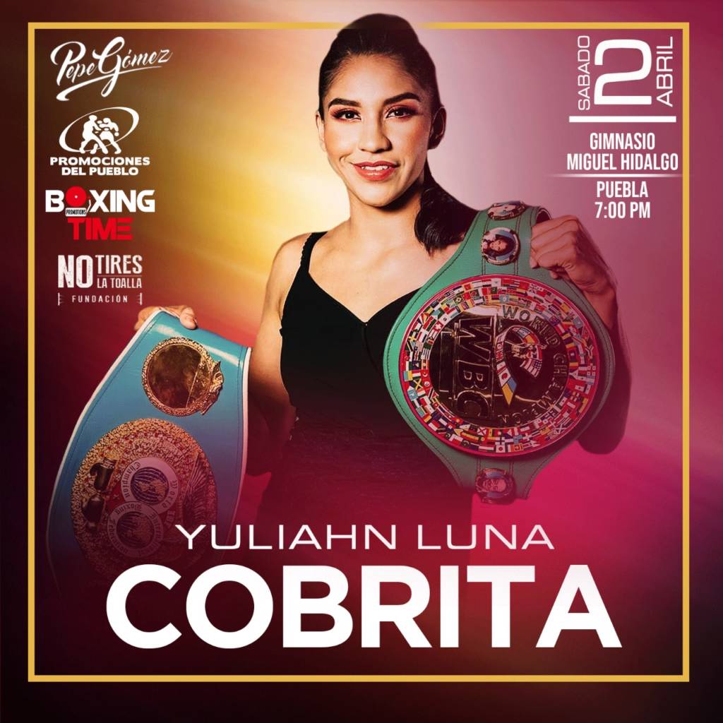 Será el próximo sábado 2 de abril, cuando la lagunera Yuliahn ‘Cobrita’ Luna exponga el título absoluto de peso gallo que avala el Consejo Mundial de Boxeo; frente a la noqueadora capitalina Mayeli Flores, que se presenta a este cotejo sin conocer la derrota, en una defensa de alto riesgo para la monarca de las 118 libras.
