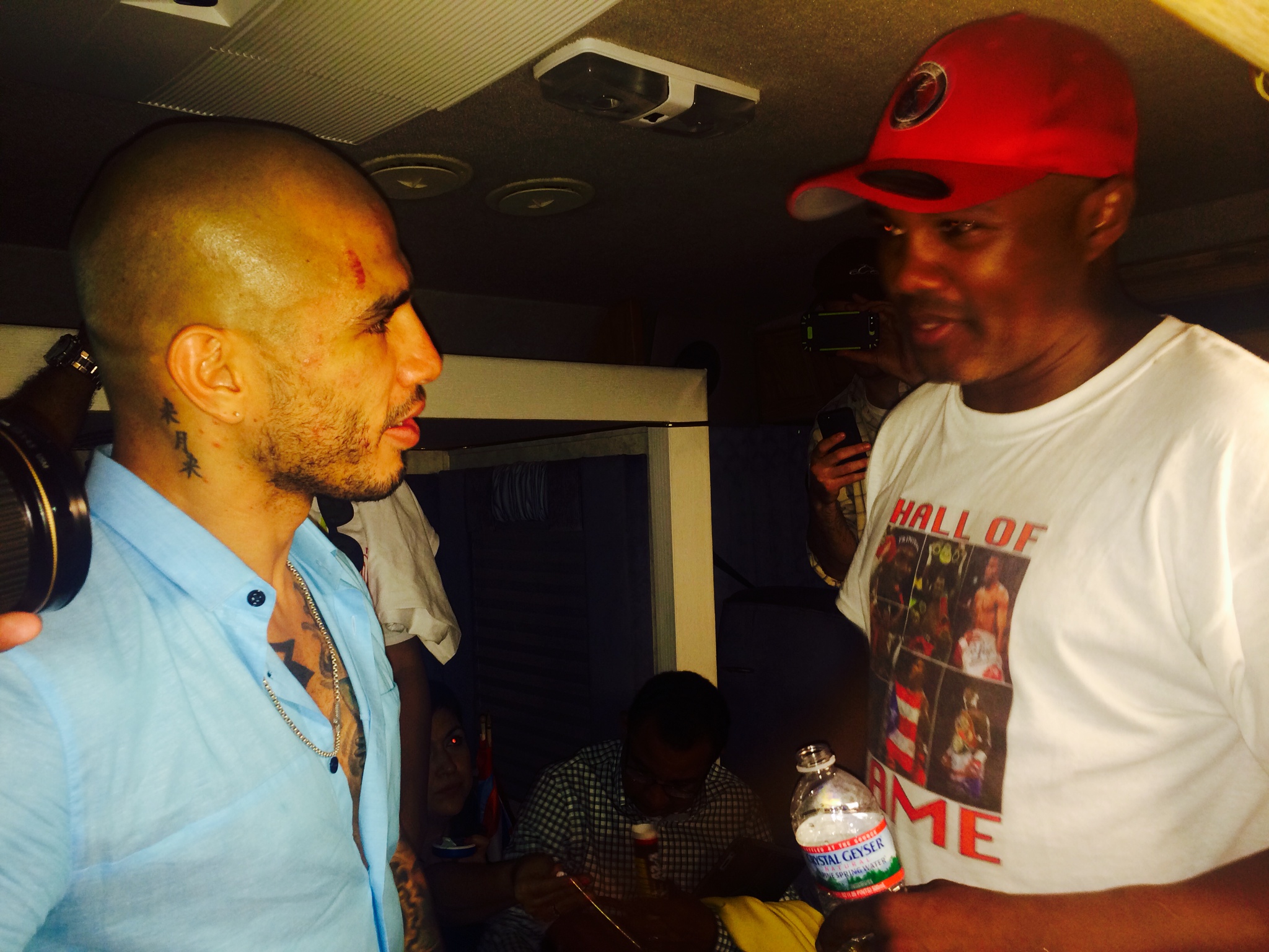 Cotto entró al camerino en el que se encontraba Trinidad para felicitarlo por su exaltación el domingo y luego lo acompañó hasta la tarima en donde luego ambos fueron vitoreados por la afición.