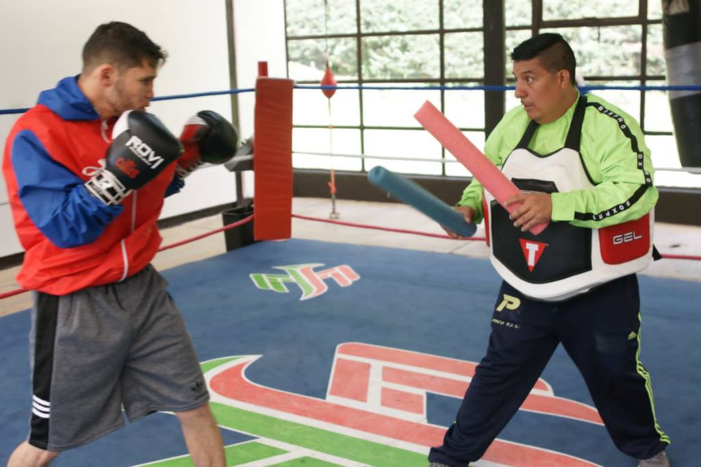 El entrenador Manuel López en el gimnasio de box del Centro Ceremonial Otomí entrenando a Carlos Cuadras; recuperar el título para México, es el objetivo principal.