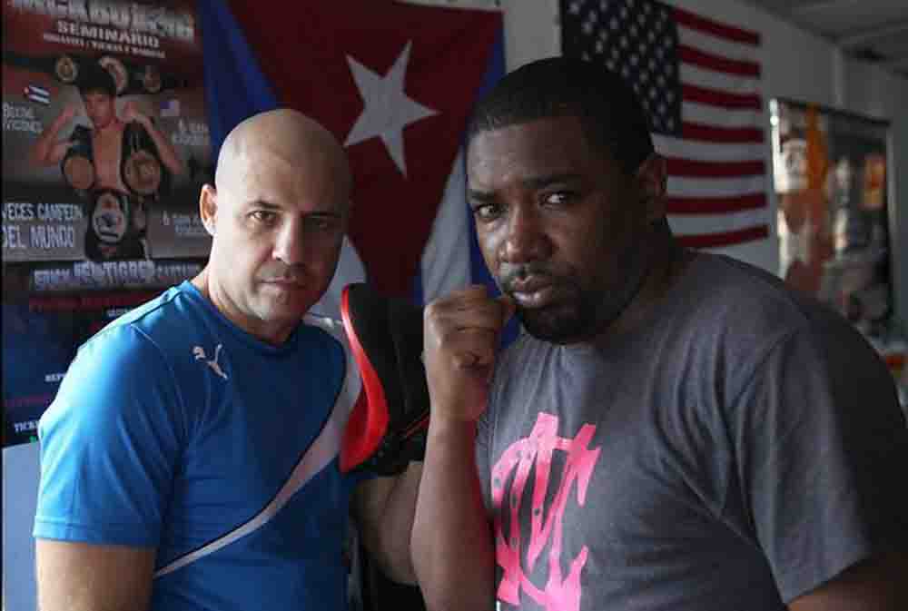 El boxeador cubano Inocente Fiz (der.) y su entrenador Eric Castaños posan en un gimnasio en Miami el 17 de diciembre. Pedro Portal / El Nuevo Herald