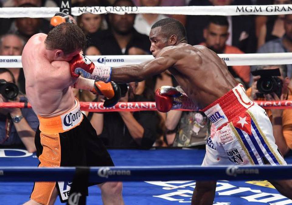 ERISLANDY LARA golpea al Canelo en el 10mo asalto de la pelea celebrada el 12 de julio en el MGM Grand Garden Arena en Las Vegas, Nevada.Ethan Miller/Getty Images