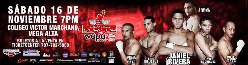Caguas, PR- 5 de Noviembre – La excitante serie ““Boxeo Boricua WAPA 2” regresa el sábado 16 de noviembre en el Coliseo Victor Marchand en Vega Alta cuando marque el regreso de Janiel “Pototto” Rivera; ex-campeón mundial plata división paja versión del Consejo Mundial de Boxeo. Janiel quien perdiera su invicto el pasado 13 de julio ante el veterano Miguel “Samurai” Del Valle en Aguas Buenas buscará regresar al camino de la victoria pero antes tendrá que enfrentar al escurridizo Joel Collazo (3-1, 1Ko) de Maunabo en un combate a 6 asaltos en la división mini mosca. “Estoy contento con mi regreso, sin duda alguna tuve una mala noche en mi última pelea. Estoy listo para los retos y el 16 de noviembre mi mente está en vencer a Collazo y esperar un nuevo año lleno de grandes oportunidades” ,comentó Janiel Rivera. Por otro lado el invicto Alberto “El Explosivo” Machado (5-0, 3Ko’s) volverá a la acción para medirse a José Santiago de Bayamón en un duelo a 6 asaltos en la división Super Pluma. “Estamos trabajando fuerte en el gimnasio para hacer una buena pelea y llevarnos la victoria. Gracias a Dios salimos bien de la última pelea. Estamos concentrados en Jose Santiago y ganar fuertemente”, dijo Machado. El veterano peleador invicto Angel “Pito” Fret hará su sueño realidad de pelear por primera vez frente a todos sus compueblanos de Vega Alta “Para mí es un gran honor pelear por primera vez frente a toda mi gente. Desde que comencé en el boxeo siempre fué mi sueño”, comentó Angel Fret. Tambien estará en acción Miguel “Mikito” Soto (11-1, 11Ko’s) quien busca recuperarse de su primera derrota como profesional cuando se mida al peligroso Christopher Rivera. Los invictos Charlie Clemente, Starling Cordero también estarán en acción mientras que José Rodríguez y Eric De Jesús harán su debut como profesional.