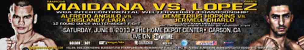 Maidana vs López, una pelea a 12 asaltos por el campeonato Intercontinental welter de la AMB en poder de Maidana, es promovida por Golden Boy Promotions y patrocinada por Corona y AT&T. El triple evento se llevará a cabo el sábado 8 de junio desde el The Home Depot Center en Carson, California y será televisado en vivo por SHOWTIME CHAMPIONSHIP BOXING comenzando a las 10:00 p.m. ET/7:00 p.m. PT. Maidana vs López es presentada en asociación con Goossen Tutor Promotions y Thompson Boxing Promotions. También se presentará una batalla a 12 asaltos en peso superwelter entre el guerrero de pura acción Alfredo “El Perro” Angulo y Erislandy Lara, clasificado número 1 superwelter del CMB, y un duelo a 12 episodios entre el experimentado Demetrius Hopkins, monarca superwelter de la USBA, y el invicto fenómeno Jermell Charlo, campeón superwelter Continental de las Américas del CMB. El evento transmitido por SHOWTIME se puede escuchar en español utilizando la programación de audio secundario (SAP). Peleas preliminares serán transmitidas por SHOWTIME Extreme a las 8:00 p.m. ET/PT (diferido en la Costa Oeste).