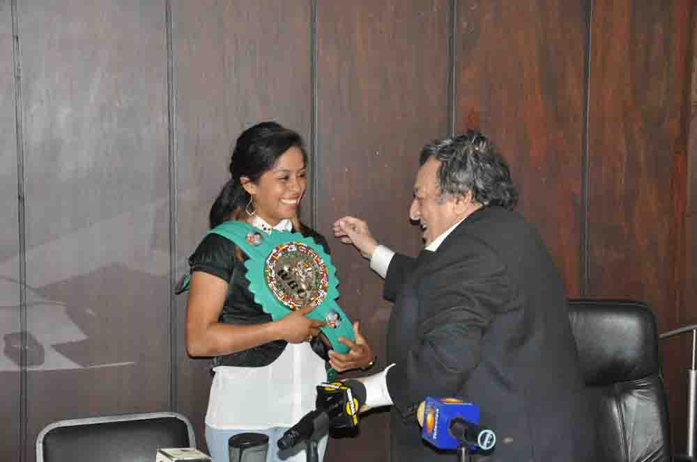 La guapa peleadora y campeona mundial plata de peso paja del Consejo Mundial de Boxeo, Victoria Argueta, estuvo presente con los medios de comunicación en las charlas de café con don José Sulaimán en las oficinas de la entidad boxística en la Zona Rosa.