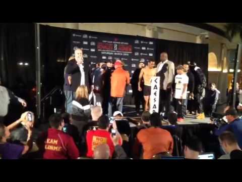 Atlantic City, NUEVA JERSEY – El carolinense Thomas Dulorme ( 20-1, 14 KO ) de Puerto Rico y Karim Mayfield ( 18-0-1 , 11 KO ) de California pesaron 139.8 y 139.6 libras respectivamente para su pelea de mañana por HBO que será por el título vacante de la NABF del CMB en las 140 libras, pero los ánimos se caldearon cuando ambos boxeadores posaron para las fotos del cara a cara. Mayfield pegó en dos ocasiones su boca en el pecho de Dulorme, quien en respuesta lo empujó y de inmediato, ambos peleadores se agarraron de cuellos, lo que causó un forcejeo en el entarimado con ambos equipos de trabajo separando a sus peleadores.