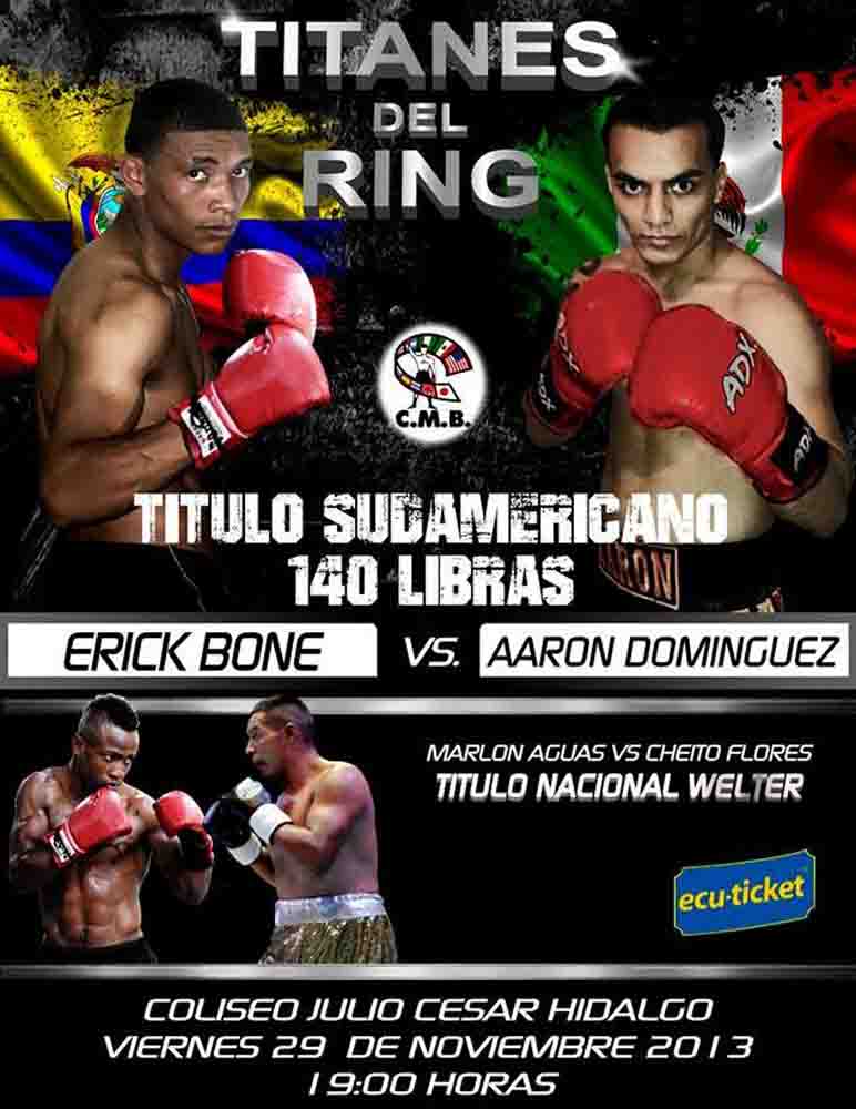 Todo se encuentra acordado para que suene la campana el sábado 29 de noviembre en el Coliseo Julio Cesar Hidalgo, de la capital ecuatoriana. La pelea estelar la brinda el prometedor pegador nacido hace 24 años en Manabí, Erick “Relampágo” Bone (12-1-0, 7 KO´s). En esta ocasión disputa con el duro mexicano Aaron Domínguez (17-9-1, 10 KO´s). Estará defendiendo el crédito ecuatoriano su cinturón 140 libras Sudamericano del Consejo Mundial de Boxeo.