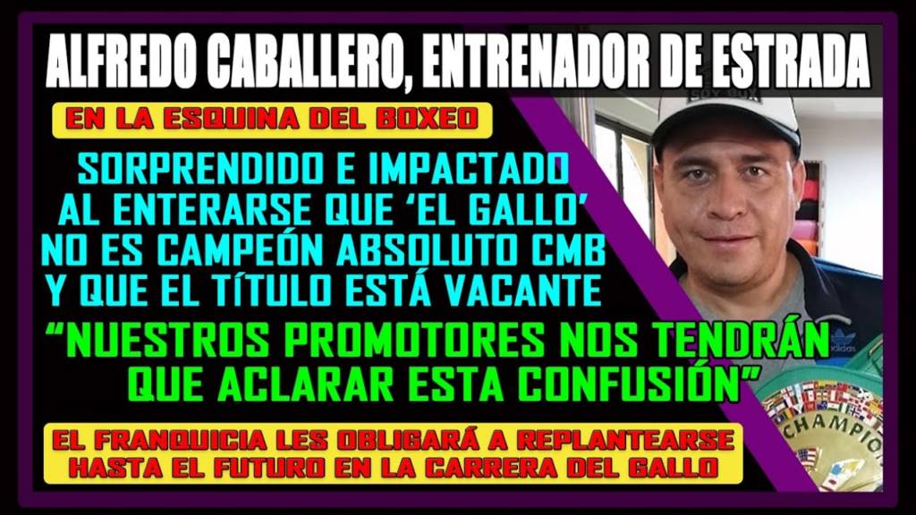 Alfredo Caballero, entrenador del Gallo Estrada, hablando en La Esquina del boxeo se reconoció impactado al conocer la noticia de que el Gallo no es campeón y que el CMB puso su título vacante cuando Estrada pasó a la condición de Franquicia. Entienda aquí el alcance de sus respuestas.