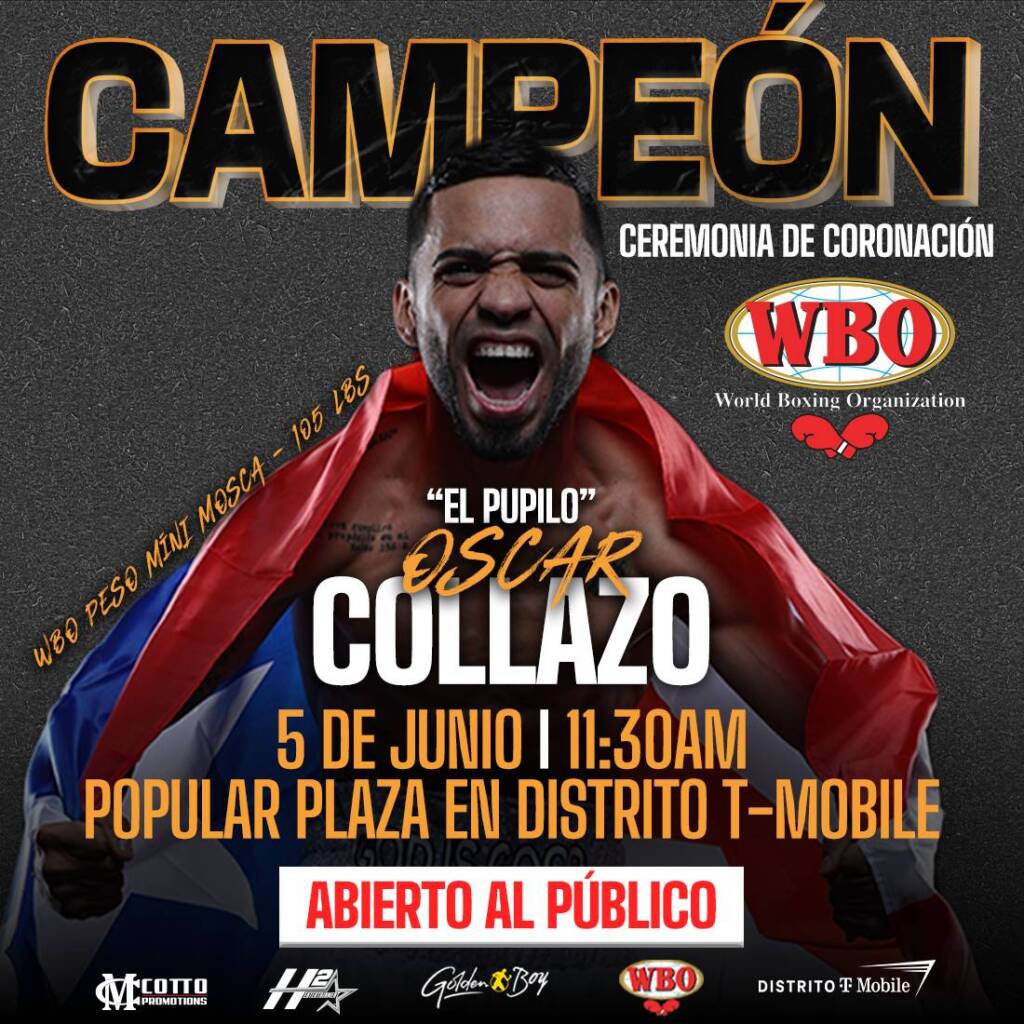 San Juan, PUERTO RICO – La Organización Mundial de Boxeo (OMB), presidida por el licenciado Francisco Valcárcel, realizará una ceremonia especial, este próximo lunes, 5 de junio en DISTRITO T-Mobile en la ciudad capital, donde se le hará entrega al recién campeón mundial Mini Mosca (105 lbs) de la OMB Óscar ‘El Pupilo’ Collazo, su faja mundial del organismo, esto tras vencer por nocaut técnico en el séptimo asalto al campeón en aquel momento, Melvin Jerusalem, de Las Filipinas, en duelo celebrado el pasado sábado, 27 de mayo en la ciudad de Indio en el estado de California.