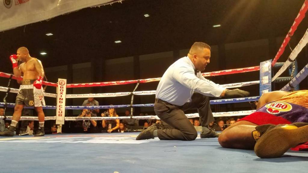 SANTANDER SIRGADO yace en la lona tras el nocaut de Tyrone Spong el 31 de agosto del 2018 en West Palm Beach. JORGE EBRO