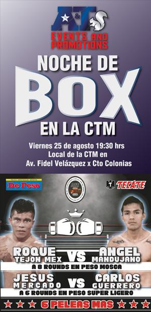 Mérida, México – Los púgiles yucatecos Roque “Tejón” Mex e Iván “Sonrics” Ramírez pusieron virtual fin a su preparación para sus peleas del próximo viernes en la arena C.T.M. de esta ciudad, donde enfrentarán en sendos combates a Ángel “Panterita” Mandujano y a Javier “Rapidito” Vera en promoción de la empresa A&T.