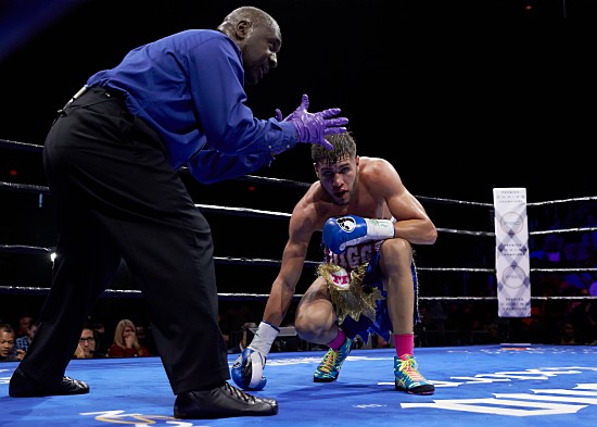 Prichard Colón toma su tiempo de recuperación en el séptimo asalto mientras recibe la cuenta del referí Joe Cooper. (Suzanne Teresa / PBC)