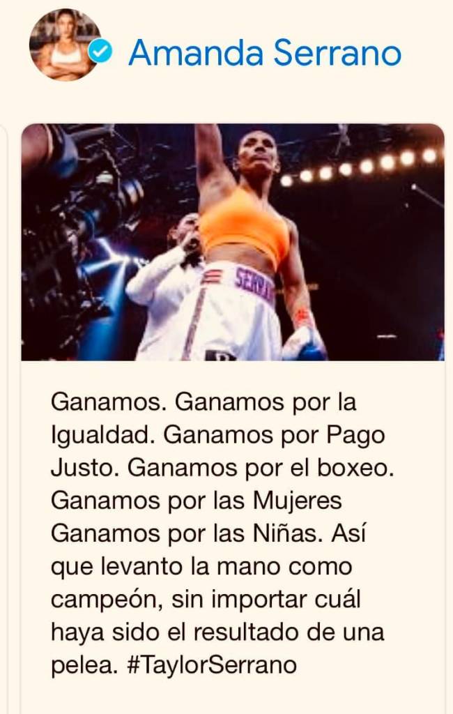Amanda Serrano se tomó la derrota con la filosofía de una campeona auténtica en un deporte donde se pierde y se gana. Un espíritu deportivo que en este negocio del boxeo, las grandes figuras parecen desconocer. La memorable pelea que nos regalaron con Taylor merece ese reconocimiento si. Aplausos para Amanda. El boxeo femenino sale fortalecido de una contienda real y con pago justo a dos atletas de su calibre.