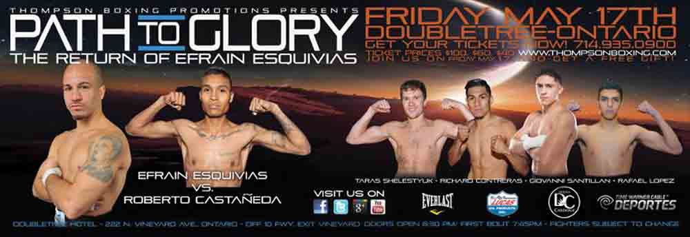 Once again, Thompson Boxing Promotions brings a fully loaded fight card to the Doubletree Hotel, Ontario, where many current boxing stars began their careers. Esquivias and Castañeda lead this newest fight parade.