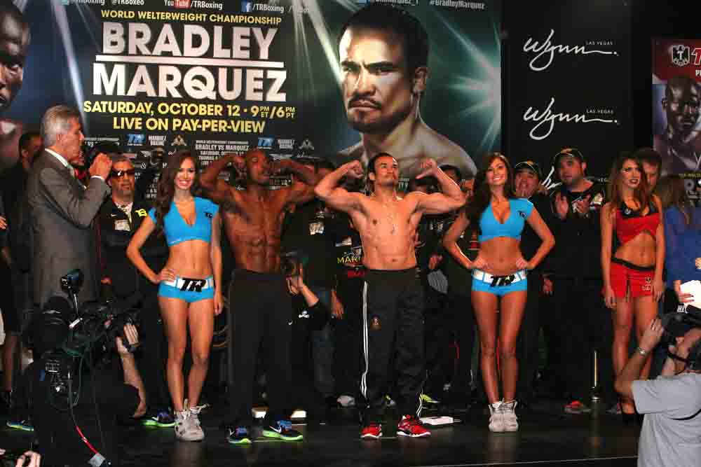 El pesaje oficial de la pelea de campeonato wélter entre Juan Manuel Márquez contra Timothy Bradley se llevó a cabo en el ‘Teather Encorne’ del lujoso hotel Wynn que es el anfitrión del combate que tendrá sede en el ‘Thomas & Mack Center’ de UNLV.