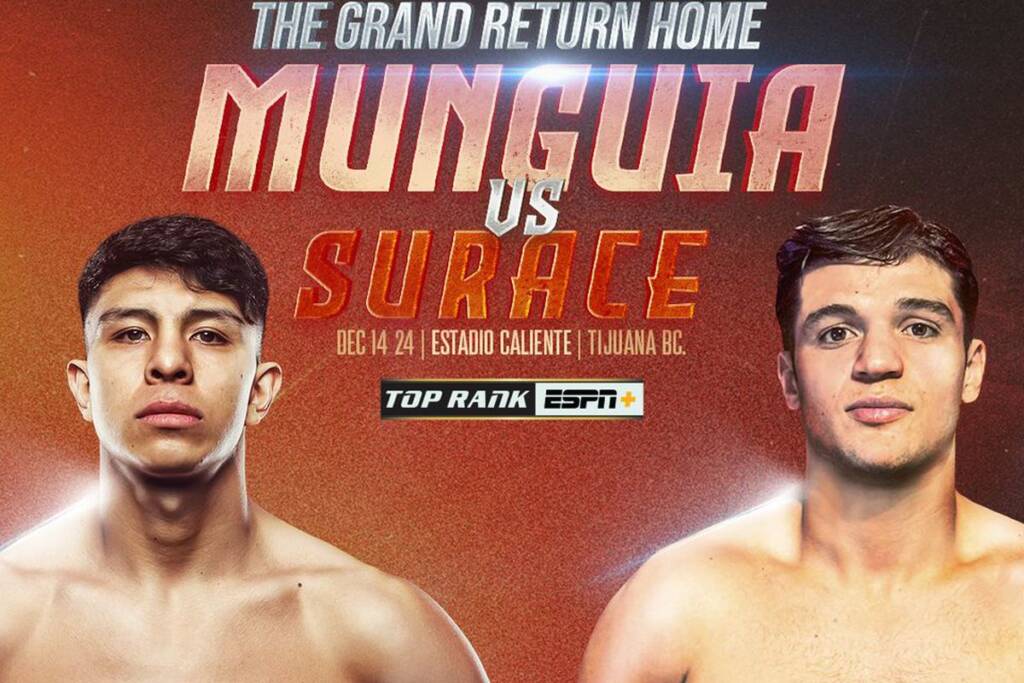 Top Rank Boxing en ESPN: Munguia vs. Surace se presentará en vivo el sábado 14 de diciembre a las 9 p.m. ET/ 6 p.m. PT exclusivamente por ESPN+ en EE.UU. El evento tendrá lugar en el Estadio Caliente de Tijuana, México.