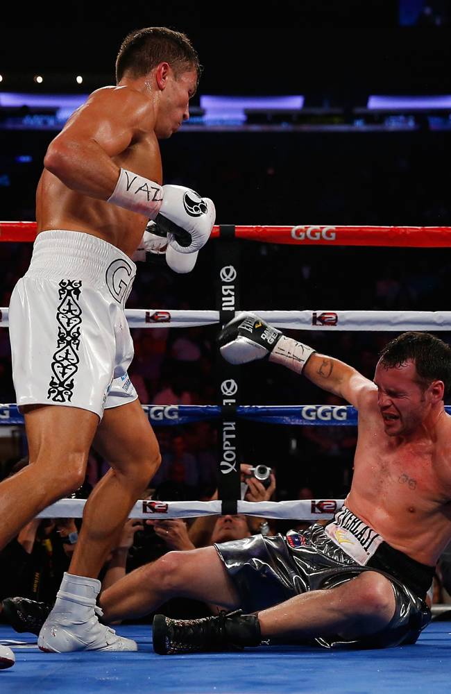 Después visitó la lona con golpes que el reprochó fueron en la nuca y en la tercer ronda, el australiano tuvo sus 15 minutos de fama al hacer alarde de ilusionista escapando por el momento de los impactos de ‘Triple G’ que sin perder la calma lo acosaba sin sosiego y en un intercambio del tercer asalto, donde Geale conectó primero en seco con la derecha, pero se le retachó la copa con otra diestra, que lo depositó de espaldas en la lona, se levantó de inmediato, pero con pajaritos alrededor y supo que no tenía nada que hacer en el ring.