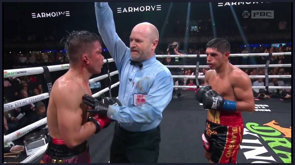 Los jueces Mike Fitzgerald (97-93), Jerome Jakubco (98-92) y Zac Young (97-93) tenían a Martínez por delante en el momento de la interrupción. Bornea boxeó con sangre fluyendo de su oreja derecha durante las últimas dos rondas.