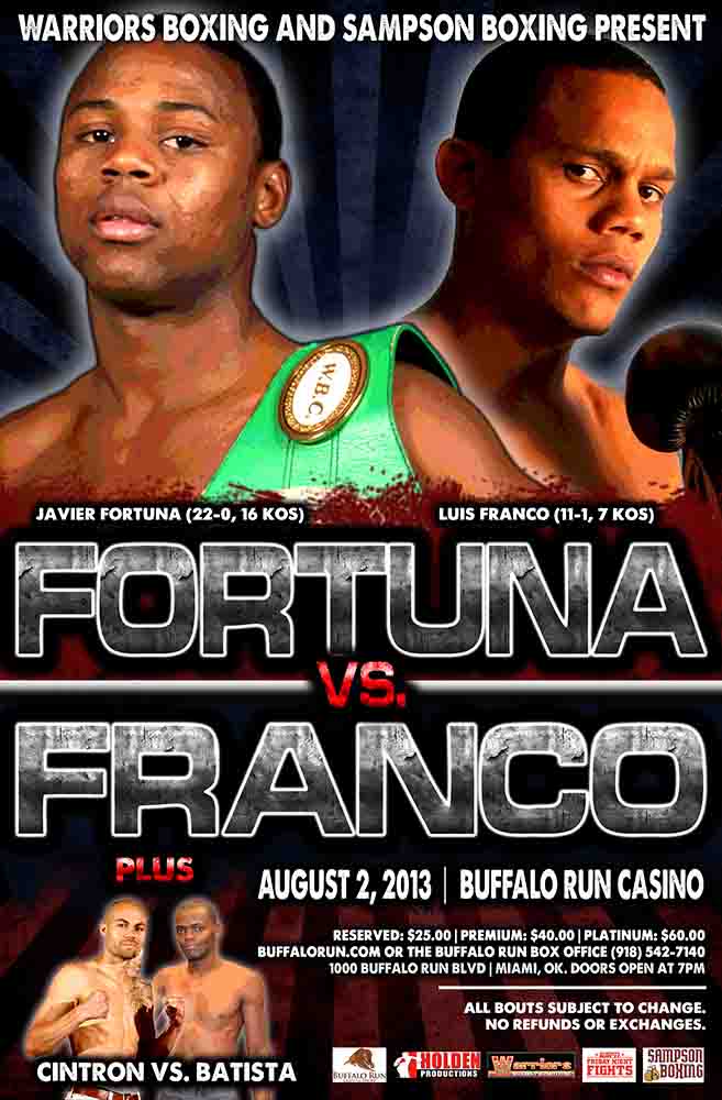 La edición de esta semana de ESPN Friday Night Fights contará con el invicto peso pluma, Javier “El Abejón” Fortuna (22-0, 16 KOs) contra Luis “La Estrella” Franco (11-1, 7 KOs) en el evento principal a 10 asaltos en el Buffalo Run Casino en Miami, Oklahoma. Fortuna, entrenado por Pablo Sarmiento (quien también entrena al campeón mediano Sergio Martínez), viene de una victoria por nocaut en el primer asalto sobre Miguel Zamudio, mientras que Franco, olímpico en 2004 para Cuba, está tratando de recuperarse de una derrota por decisión dividida de 12 asaltos con Mauricio Muñoz.