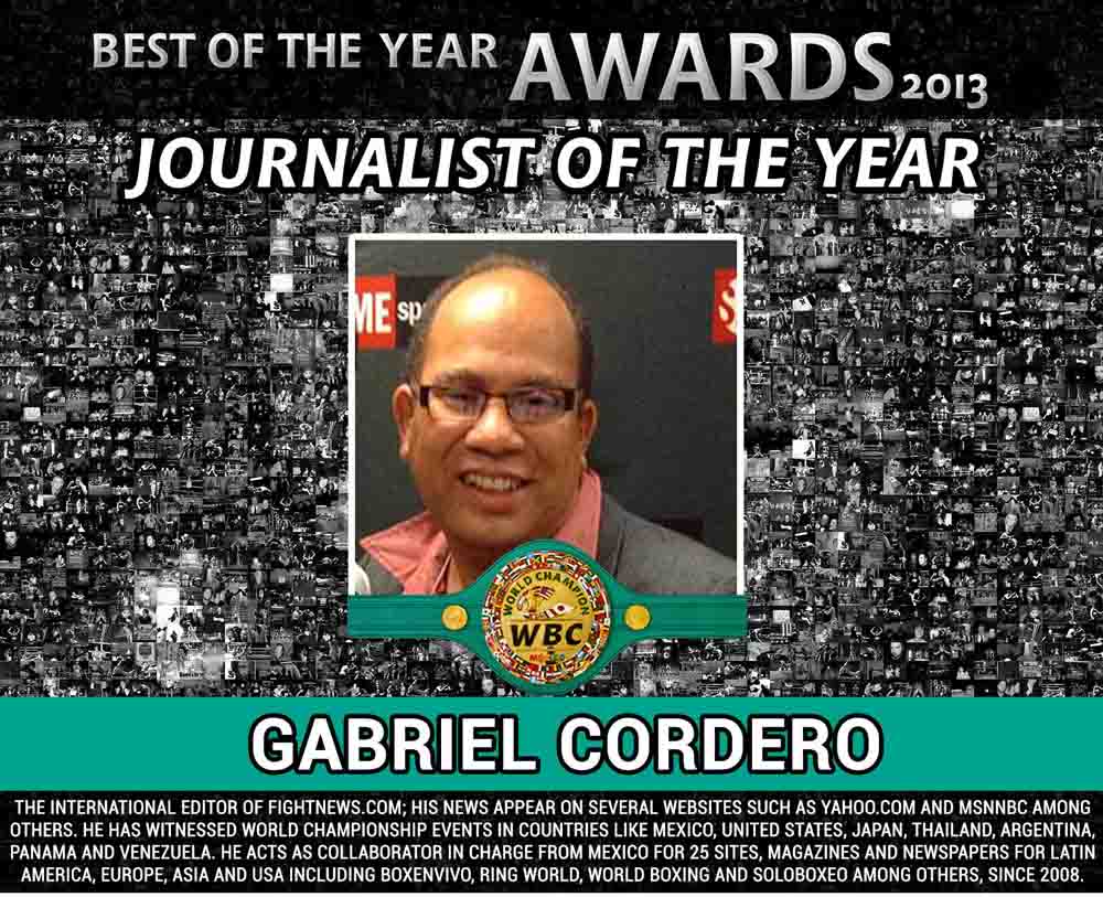 El reconocido Periodista mexicano GABRIEL FRANCISCO CORDERO fue elegido ‘Periodista del Año 2013’ por el Consejo Mundial de Boxeo (C.M.B.). Cordero ha sido testigo de grandes combates de título mundial en países como México, Estados Unidos, Japón, Tailandia, Argentina Panamá, Venezuela, entre otros.