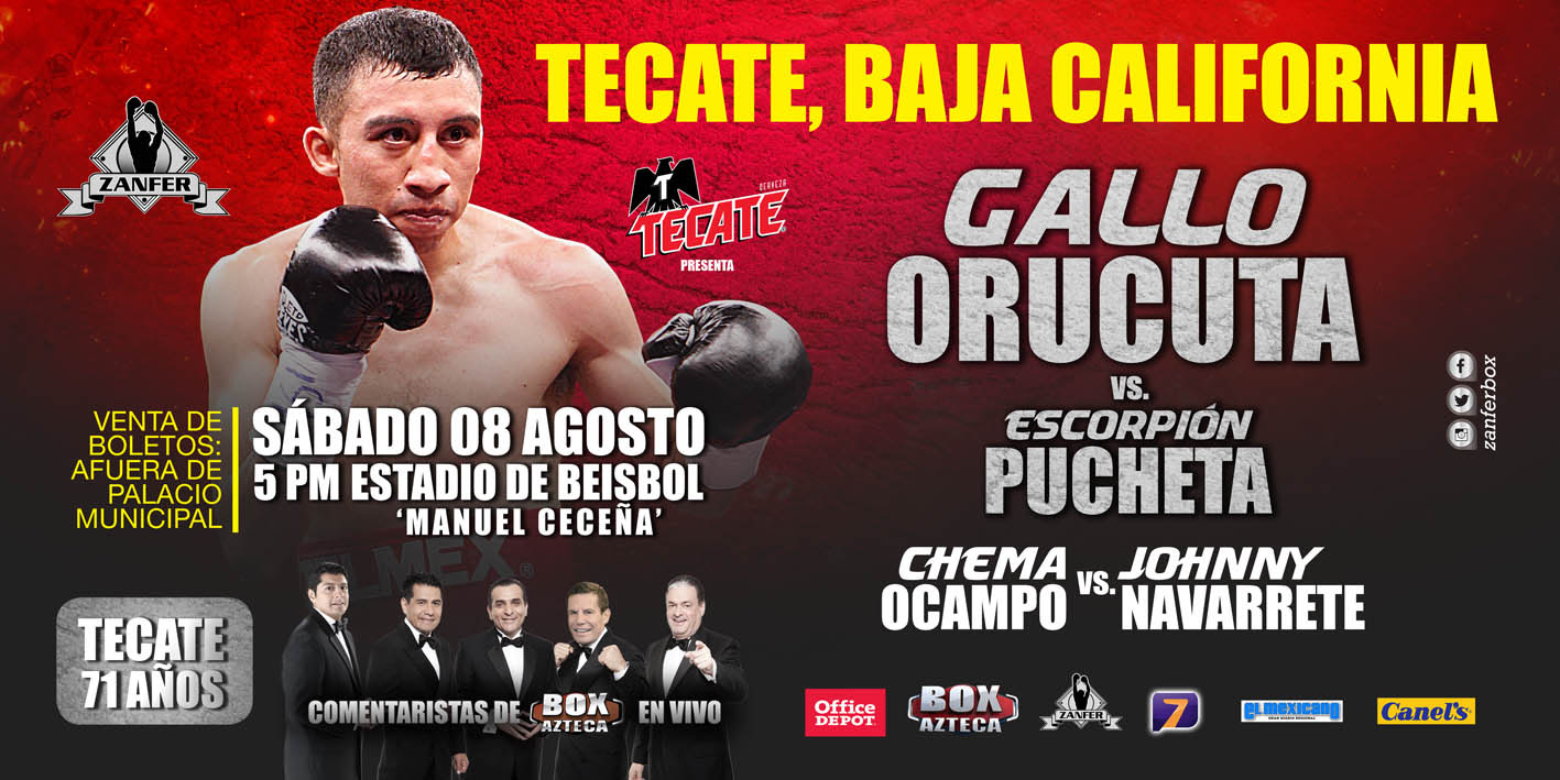 México – El dos veces contendiente al título mundial Supermosca, Felipe “Gallito” Orucuta enfrentará a Roberto “Escorpión” Pucheta en la pelea estelar de la función que se realizará el próximo sábado 8 de agosto en el estadio de beisbol Manuel Ceceña de Tecate, Baja California.