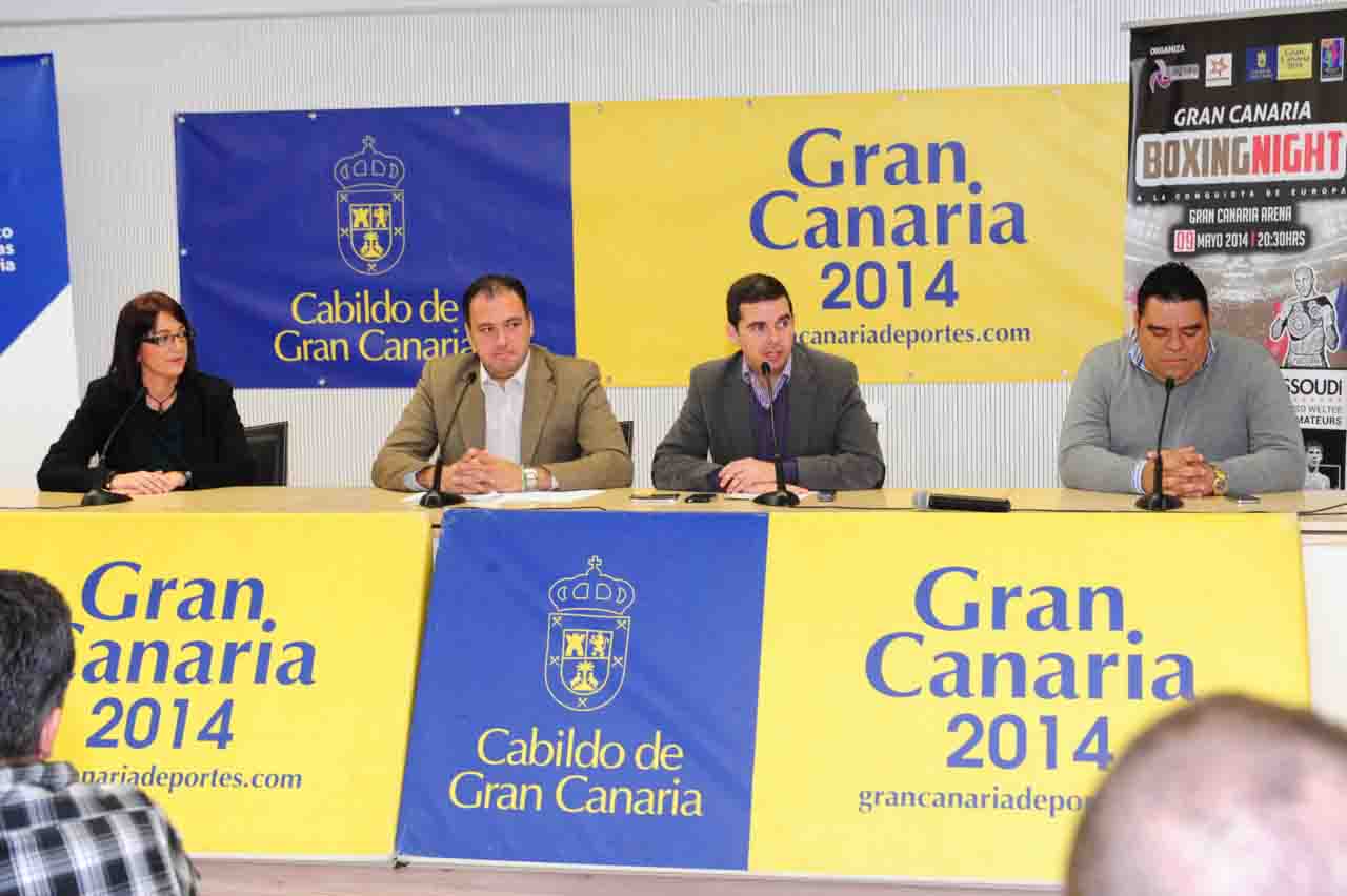 Las Palmas de Gran Canaria a 30 de abril de 2014. Durante la mañana de ayer tuvo lugar la presentación oficial del evento GRAN CANARIA BOXINGNIGHT que se celebrará el próximo viernes 9 de mayo. La presentación, llevada a cabo en las instalaciones del Gran Canaria Arena, estuvo presidida por el Consejero de Deportes del Cabildo de Gran Canaria, Lucas Bravo de Laguna, apoyado por el Concejal de Deportes del Ayuntamiento de Las Palmas de Gran Canaria, Carlos Ester, el Presidente de la Federación Insular de Gran Canaria de Boxeo, Antonio Pulido y en representación de la empresa organizadora del evento, Serie Soluciones, Virginia Ramos, quienes aportaron todos los detalles del encuentro.