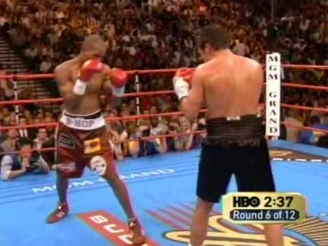 El castigo a la zona media de De la Hoya lo puso en problemas, y en el noveno asalto tocó la lona después de un gancho de Hopkins, quien desde que lo vio en la lona celebró el final de la pelea que sentenciado segundos después por el referee Kenny Bayless.