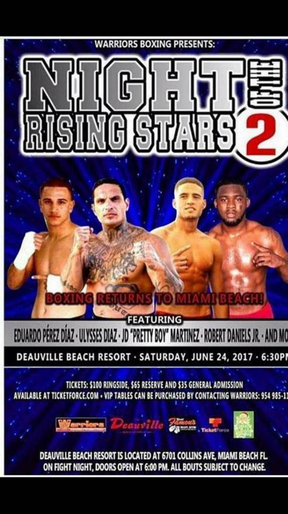 Díaz, por su parte, también espera a darse a conocer a una audiencia mayor cuando este sábado en el Hotel Douville de Miami Beach sea uno de los protagonistas de la velada de Warriors Boxing “Noche de las Estrellas en Ascenso”, en lo que será su quinta pelea profesional.