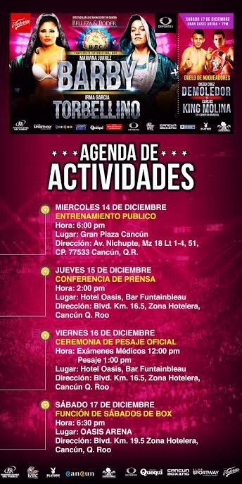 Mucha actividad tendrán los protagonistas de la velada que tendrá lugar este sábado 17 en la remodelada Oasis Arena de Cancún, Quintana Roo; en el evento encabezado por duelo entre la “Reina de Reinas“ Mariana “Barby“ Juárez y la excampeona mundial Irma “Torbellino“ García quienes disputarán el cinto Internacional gallo del Consejo Mundial de Boxeo, un pleito que llegará a millones de hogares completamente en vivo a través de las pantallas de Televisa Deportes.